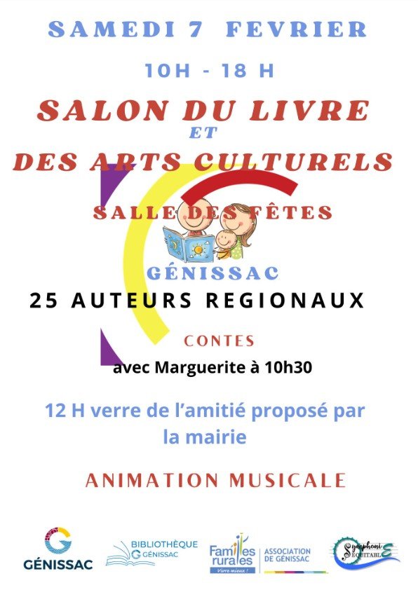 Le samedi 7 février se déroulera à la salle des fêtes de GENISSAC la 6ème édition du salon du livre et des arts culturels 10hà18h.